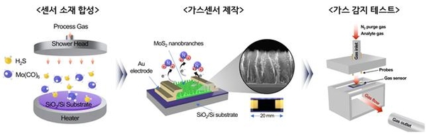 기술의 핵심은 KRISS가 자체 개발한 이황화몰리브덴(MoS2) 나노브랜치(nanobranch) 소재다. 통상 2차원의 평면 구조로 사용되는 MoS2 소재를 나뭇가지 형태의 3차원 구조로 합성해 민감도를 높였다. 대면적으로 균일한 소재 합성이 가능할 뿐 아니라, 추가적인 공정 없이 원료 물질에 포함된 탄소 비율을 조절하는 것만으로 3차원 구조를 만들어낼 수 있다.