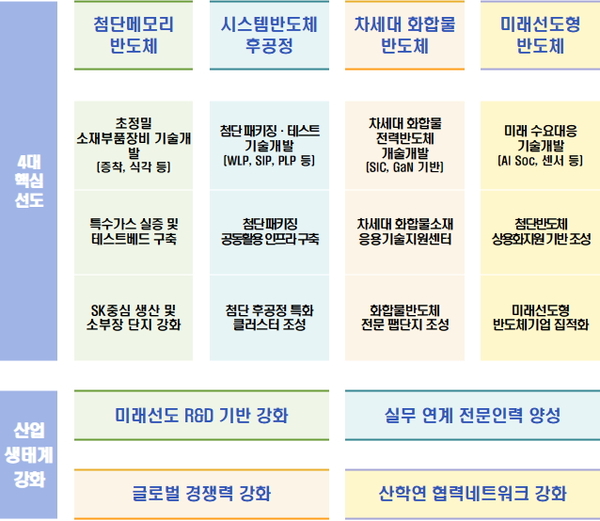 첨단 메모리반도체, 시스템반도체 후공정, 차세대 화합물반도체, 미래선도형 반도체 등 4대 핵심선도 분야를 육성하고, 관련 생태계를 공고히 하고자 2031년까지 추진될 12대 중장기 프로젝트를 수립하였다.