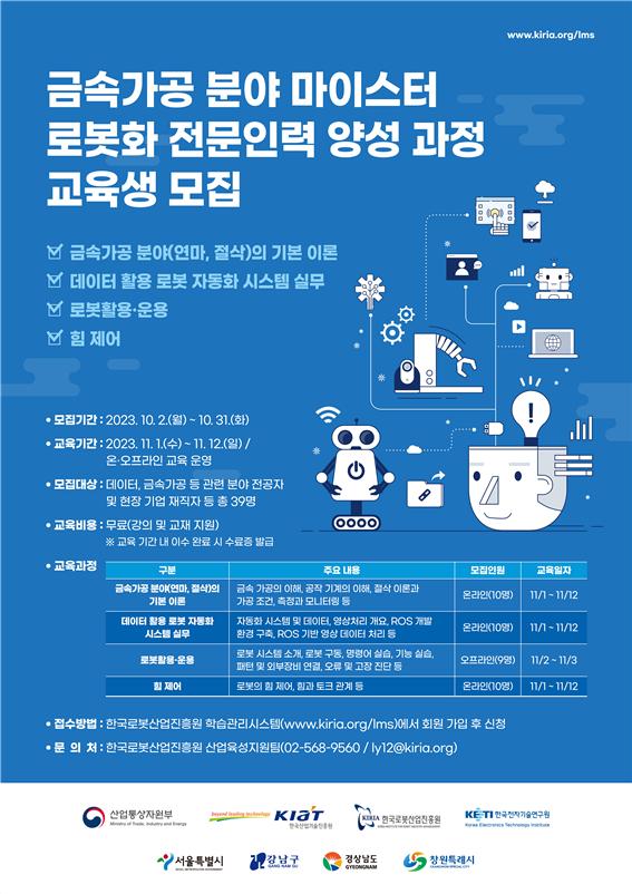 [기계신문] 한국로봇산업진흥원이 ‘금속가공 분야 마이스터 로봇화 전문인력 양성 과정‘을 추가로 개설해 오는 10월 31일까지 교육생을 모집한다고 밝혔다.