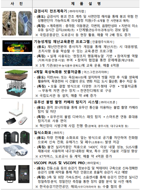 한편, 2022년 재난안전 혁신제품으로 지정된 제품 중 ‘급경사지 전조계측기’는 도로 비탈면, 산간지역의 급경사지 등에 설치되어 붕괴 위험 예측에 활용되고 있으며, 올해 상반기에 지정된 ‘질식소화포’는 화재 시 신속한 진화를 위해 주차장, 전기차 충전소 등에서 활용되고 있다.