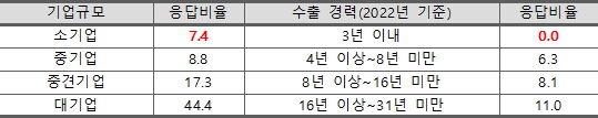 하지만 실제 기후변화에 대응하고 있는 기업은 10%에 불과했으며, 향후 대응 계획이 없다는 기업도 40.4%에 달했다. 특히, 기업규모가 작고 수출경력이 짧을수록 대응비율이 현저히 낮은 것으로 나타났다.