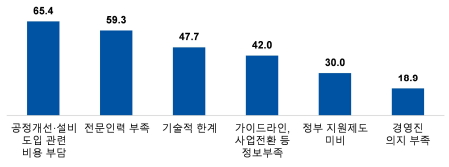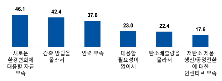 현재 기후변화에 대응하지 못하고 있다고 응답한 기업(165개사) 중 절반 가량(46.1%, 중복 응답)이 새로운 환경 변화에 대응할 자금이 부족해 기후 변화 대응 계획을 수립하지 못한다고 답변했다. 감축 방법을 몰라서(42.4%), 인력 부족(37.6%), 대응할 필요성이 없어서(23.0%)가 뒤를 이었다.