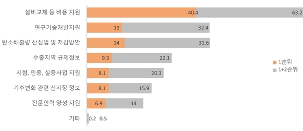 이밖에도 ‘연구‧기술개발 지원’(32.4%, 1+2순위 합산), ‘탄소 배출량 산정법 및 저감 방안에 대한 정보’(31.6%, 1+2순위 합산)가 필요하다고 응답한 기업 비중도 높게 나타나, 기후 변화 대응을 위한 기업들의 기술·정보 수준 향상을 위한 지원 방안 마련이 필요한 것으로 보인다.