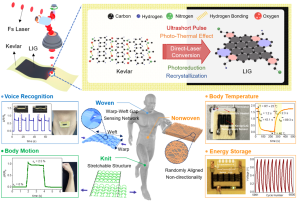기계연과 KAIST 공동 연구팀은 독성의 화학물질이나 패터닝용 광학 마스크를 사용하지 않고, 레이저 직접 패터닝 기술로 전자섬유 위에 레이저 유도 그래핀을 형성시켜 그래핀 기반 전자섬유를 성공적으로 제조했다.