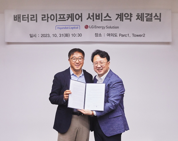 양사는 지난 10월 31일 서울 여의도 파크원에서 현대캐피탈 Auto사업본부 심장수 본부장, LG에너지솔루션 서비스사업개발TASK장 김태영 담당 등이 참석한 가운데 ‘배터리 라이프케어 상품 서비스 계약 체결식’을 진행했다.