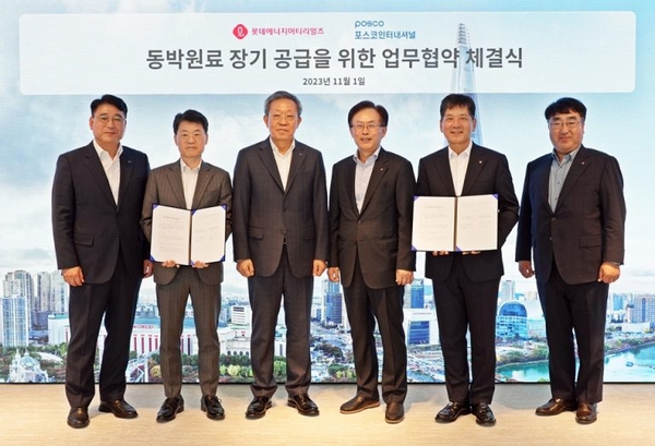포스코인터내셔널은 롯데에너지머티리얼즈와 파트너십을 강화하기 위해 양사 임원과 실무진으로 구성된 공동협의체도 구성했다. 향후 포스코인터내셔널은 해외 네크워크와 영업 노하우를 활용해 롯데에너지머티리얼즈에 안정적으로 원료를 공급함과 동시에 컨설팅도 제공할 예정이다.