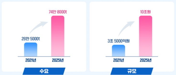SNE리서치에 따르면, 글로벌 이차전지용 동박 시장은 2021년 26만 5,000톤에서 2025년 74만 8,000톤 규모로 급성장할 것으로 예상된다. 시장 규모도 2021년 3조 5,000억 원에서 2025년에는 10조원 규모로 빠르게 커질 전망이다.