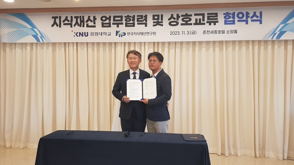 [기계신문] 한국지식재산연구원은 3일(금) 강원대학교와 지식재산 교육을 통해 지식재산 전문인력을 양성하고 새로운 일자리 창출을 지원하기 위한 업무협약(MOU)을 체결했다. 이날 협약식에는 한국지식재산연구원 손승우 원장과 강원대 데이터·지식재산융합학과 정진근 교수가 참석했다.