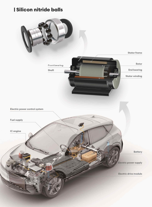 질화규소 베어링 볼은 전기차의 높은 출력 인가와 고속 회전 구동 환경 하에서 전기 침식에 의한 고장을 방지하고, 이와 함께 높은 내구성과 신뢰성을 가지는 장점이 있다.