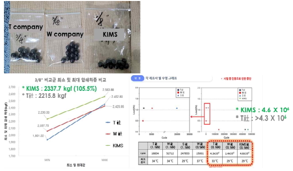 T사의 상용 볼과 연구팀의 제조 볼을 같은 조건에서 평가한 결과, 하중에 견디는 성능지표인 압쇄강도는 103~105 %로 비교 우위의 값을 보였고, 장시간 고속 회전을 견디는 성능지표인 구름피로수명의 경우, 동등 수준의 값을 얻을 수 있었다.