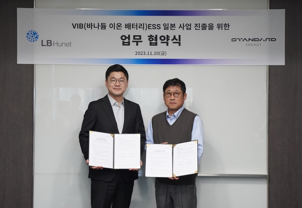 [기계신문] 스탠다드에너지는 10일(금) 서울 구로구 LB휴넷 본사에서 IT, 전자 등 첨단제품의 글로벌 유통 및 영업에 전문성을 가진 LB휴넷에 바나듐이온배터리(VIB) ESS(Energy Storage System, 에너지저장장치)의 일본 내수시장 영업권을 부여하는 계약을 체결했다고 밝혔다.