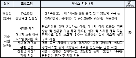 또한, 탄소중립 이행의 중요성 제고와 지역이 주도하여 기획한 지역특화 프로젝트 ‘레전드 50+’의 성공적인 이행을 위해 탄소중립 경영혁신 이용권 및 지역자율형 이용권은 ‘중기업’까지 지원대상을 확대한다.