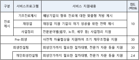 2024년 지원예산은 총 558억 원(정부안 기준)으로 이번 1차 공고를 통해 일반 이용권, 탄소중립 경영혁신 이용권, 재기상담 이용권 3개 유형에 약 400억 원을 지원할 계획이다. 선정된 기업에게는 최대 5,000만원 한도 내에서 서비스를 제공한다.