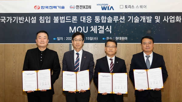 [기계신문] 현대위아는 지난 15일 경남 창원 본사에서 한국전력기술, 한전KDN, 토리스스퀘어와 ‘국가기반시설 침입 불법 드론 대응 통합솔루션 기술개발 및 사업화 협약(MOU)’을 체결했다고 밝혔다.