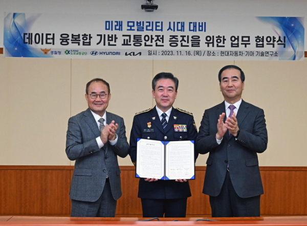 [기계신문] 현대자동차∙기아는 16일(목) 경기도 화성시 남양기술연구소에서 경찰청, 도로교통공단과 ‘미래 모빌리티 시대 대비 데이터 융복합 기반의 교통안전 증진을 위한 업무협약’을 체결했다.
