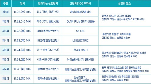 경기도가 주최하고 경기환경에너지진흥원이 주관하는 이번 설명회는 경기 산단 RE100 사업의 8개 협약 투자사와 각각 1회씩 총 8회 개최된다.