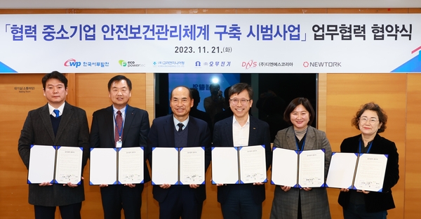서부발전은 지난 21일(화) 충남 태안 본사에서 ‘협력 중소기업 안전보건관리체계 구축 시범사업 협약식’을 진행했다. 행사에는 이상현 서부발전 기획본부장과 허응무 뉴토크코리아 대표, 조윤숙 에코파워텍 대표, 안상근 고려엔지니어링 대표, 강인순 오무전기 대표, 김대상 디엔에스코리아 대표 등 협약사 관계자들이 참석했다.