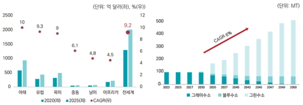 세계 수소 생산 시장은 2020년 1,296억 달러에서 연평균 9.2%씩 성장하여 2025년에는 약 2,014억 달러에 이를 것으로 전망된다. 국내에서는 2050년 기준 수소 생산 시장이 2,790만 톤 규모로 성장할 것으로 예상되며, 이 중 500만 톤을 국내에서 생산하는 것을 목표로 하고 있다. 이때 청정수소 국내 생산 비중은 300만 톤 수준으로 예상된다.