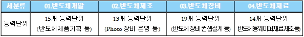 공단과 기업, 산업계 협회·단체, 교육·훈련·산업현장 전문가들에 의해 현재까지 국가직무능력표준 세분류 1,093개가 만들어졌다. 특히 반도체 분야 국가직무능력표준은 최근 산업의 급격한 고도화 및 직무 세분화를 반영하여 지난 11월 개선이 완료됐다.