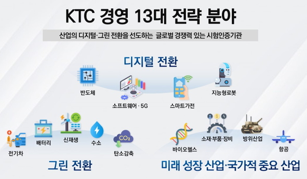 KTC는 디지털 전환·그린 전환·미래 성장 및 국가적 중요산업으로 구성된 ‘KTC 경영 13대 전략 분야’ 로드맵을 수립하여 우리 기업의 기술력 향상과 글로벌 경쟁력 강화를 지원하고 있다. 특히 항공·우주, 방산 분야에서 기술 표준 개발, 제품·부품 및 시스템 연구, 지원 활동을 강화하고 있다.