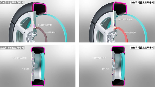 이 기술은 형상기억합금으로 이뤄진 모듈이 평상시에는 휠과 타이어 내부에 숨어있다가 전기적 신호를 받으면 타이어 바깥으로 돌출되며 스노우 체인의 역할을 하는 원리다.