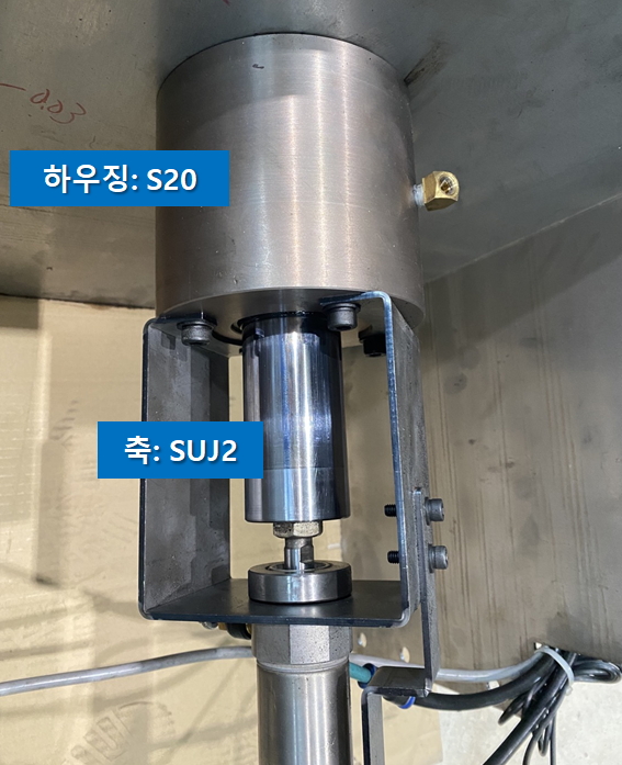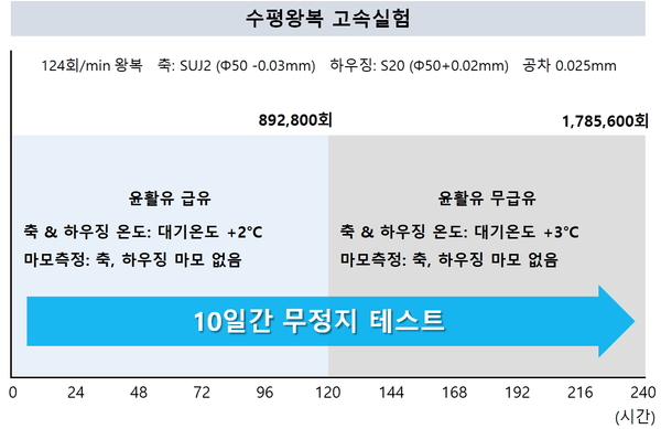 성능 검증 실험은 축(베어링강, SUJ2)의 지름 Φ50-0.03 ㎜, 하우징(S20) 내경 Φ50+0.02 ㎜로 제작되었으며, 0.025 ㎜(25 ㎛)의 간격으로 설정하여 총 240시간 180만 번 고속왕복운동을 수행하였다.
