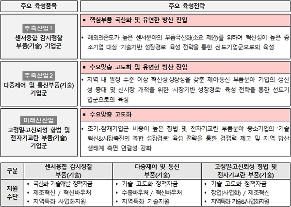 대전시는 센서 융합 감시정찰 부품(기술), 다중제어 및 통신 부품(기술), 고정밀·고신뢰성 항법 및 전자기교란 부품(기술)별 참여기업군 성장전략에 따라 ▲핵심부품 국산화를 위한 기술개발 자금 지원 및 스마트공장 구축 ▲방산 분야 전환을 위한 창업 컨설팅 및 재도약 자금지원 ▲군수요 커스터마이징 고도화를 위한 개발기술 사업화 자금 및 수출바우처 등을 지원할 계획이다.