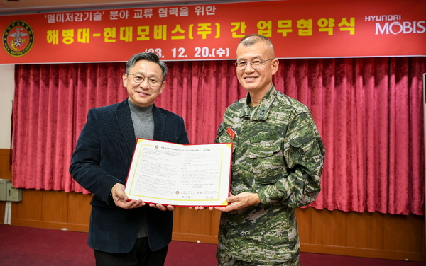 [기계신문] 현대모비스는 지난 12월 20일(수) 대한민국 해병대와 ‘멀미저감 기술분야 협력’을 위한 양해각서(MOU)를 체결했다고 밝혔다. 경기도 화성 해병대사령부에서 진행된 체결식에는 이승환 현대모비스 선행연구섹터장과 박승일 해병대사령부 전력기획실장을 비롯해 양측 관계자들이 참석했다.