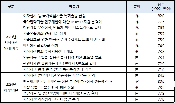 이번에 선정된 이슈들은 크게 ‘핵심기술 특허 확보’(5개), ‘지식재산 보호 및 집행’(4개), ‘기타’(6개)로 나뉘는데, 2023년 10대 이슈 중 1~3위 모두 ‘핵심기술 특허 확보’로 나타나 최근 심화되고 있는 기술경쟁 상황에서 각계의 특허 확보에 대한 관심이 크게 증가한 것으로 풀이된다.