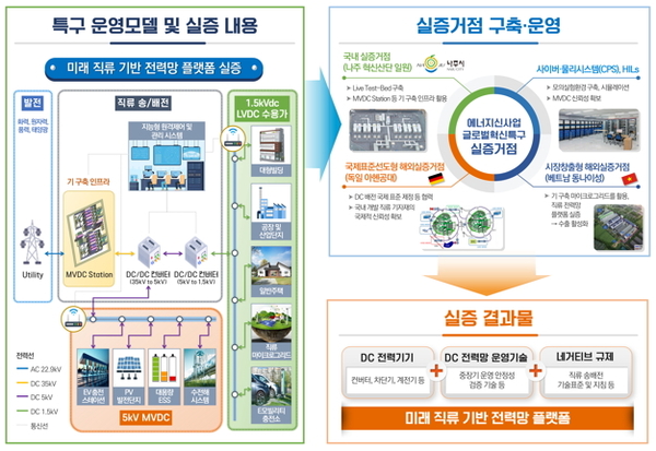 1단계로 2024~2027년 나주 혁신산단 일원에 국내 실증을 위한 상용실험장(Live Test-Bed)을 구축한다. 사이버·물리시스템(CPS), 힐스(HILs) 장비를 활용해 직류(DC)에서 발생하는 다양한 사고 및 환경 변화를 모의실험하고 독일, 베트남 등 해외실증거점과 연계해 글로벌 표준과 기준을 마련한다.