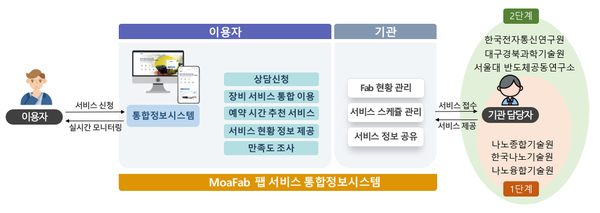 MoaFab은 나노팹 간 연계·협력을 기반으로 이용자 중심의 서비스 개선을 목표로 추진되었으며. 팹 이용자 관점에서 ▲팹 서비스 신청·관리 일원화 ▲신청서비스 진행현황 실시간 모니터링 ▲예약 시간 추천 서비스 ▲팹 기관 장비 정보 제공 등의 편의 기능을 제공한다.
