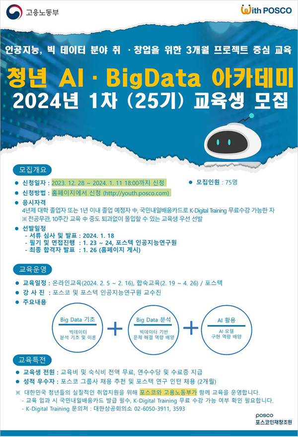 [기계신문] 포스코가 24-1차 청년 AI·빅데이터 아카데미 교육생을 모집한다. 포스코는 청년들의 취업 경쟁력 확보를 돕기 위해 2019년부터 청년 AI·빅데이터 아카데미를 진행해왔다.