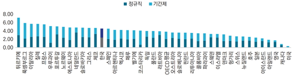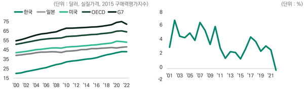 2022년 기준 우리나라의 노동생산성은 OECD 37개국 중 29위로 하위권을 기록했으며, 노동생산성 증가율 역시 둔화되고 있다. 우리나라 생산성 증가율 둔화의 배경으로는 ▶기업의 저조한 디지털 전환 수준 ▶대·중소기업의 생산성 격차의 심화 ▶제조업과 서비스업 간 생산성 격차의 심화 ▶경직된 노동시장 등이 지목된다.
