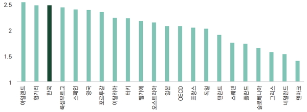 우리나라의 제조-서비스업 간 생산성 격차는 제조업 중심 국가인 독일·일본에 비해 높은 것으로 나타난 바, 이를 해소하기 위한 ▶서비스업 수출 장려 및 대외 개방을 통한 서비스업 경쟁력 강화 ▶제조업의 서비스화를 통한 서비스 산업 생산성 향상이 필요하다. 2022년 기준 우리나라의 제조-서비스업 생산성 격차는 49.8로, OECD 평균인 80.2를 크게 하회했다.