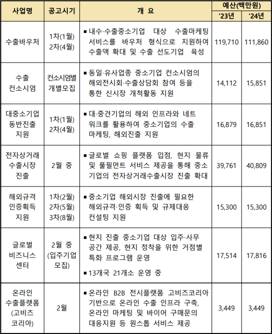 2024년 중소기업 수출지원사업은 중소기업이 온·오프라인 수출부터 현지진출까지 종합적으로 지원받을 수 있도록 수출바우처, 전자상거래수출시장 진출, 글로벌비즈니스센터 등 7개 사업으로 구성되어 있다.
