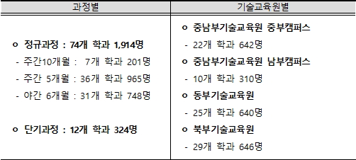 이번 상반기 모집은 ▶정규과정(주간 10개월, 주간 5개월, 야간 6개월) 74개 학과 1,914명과 ▶단기과정 12개 학과 324명 등 총 86개 학과에서 2,238명의 훈련생을 선발한다. 올해 신설된 학과로는 리모델링 시공, 자동차 판금도장 학과가 있다.