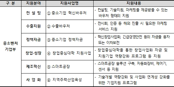 지원 예정 사업으로는 ▲중소기업 혁신바우처 ▲수출바우처 ▲중소기업 정책자금 ▲창업중심대학 ▲스마트공장 ▲지역주력산업육성 총 6개 분야가 있다. 참여기업에 선정되면 지원사업에 참여할 자격요건을 얻어 올해부터 2026년까지 최대 3년간 집중 지원받게 된다.