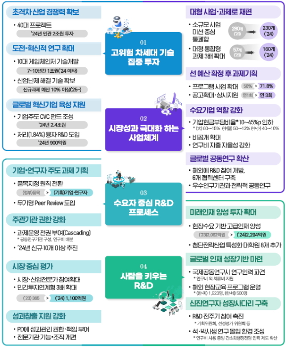이를 위해 산업 초격차 달성을 위한 미션 중심의 11대 분야 40개 초격차 프로젝트에 2024년 신규예산의 70%를 배정해 민관합동으로 약 2조원(정부 1.3조원)을 투자한다.