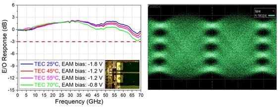 연구진이 이번에 개발한 224Gbps 전계흡수변조형 광원 소자는 세계 최고 수준인 70℃에서 70GHz 이상의 변조대역폭을 보였다. 상온뿐만 아니라 70℃에서도 224Gbps, 2km 광전송이 가능한 우수한 성능인 셈이다.