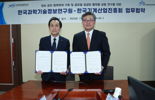 [기계신문] 한국기계산업진흥회는 한국과학기술정보연구원(KISTI)과 26일(금) KISTI 서울분원에서 ‘국가 R&D·정보자원과 글로벌 공급망 관련 정보의 공동 활용을 위한 플랫폼 개발 및 협력체계 구축 협약’을 체결했다고 밝혔다.