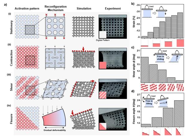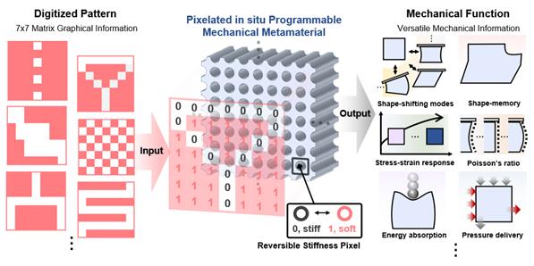 연구팀은 융합된 합금을 통해 디지털 패턴의 정보(0=액체, 1=고체)를 표현하고 실시간으로 디지털 패턴 명령어를 입력할 수 있도록 설계했다. 입력된 디지털 패턴을 통해 메타 물질의 모양, 강도, 변형 비율 등 다양한 성질을 실시간으로 조절 가능하다.