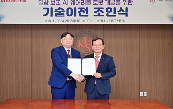 [기계신문] 한국과학기술연구원(KIST)은 5일(월) 서울 성북구 KIST 본원에서 삼익THK와 인공지능(AI) 기반 웨어러블 고관절 복합체 근력 보조 로봇 기술 개발을 위한 기술이전 조인식을 개최했다.