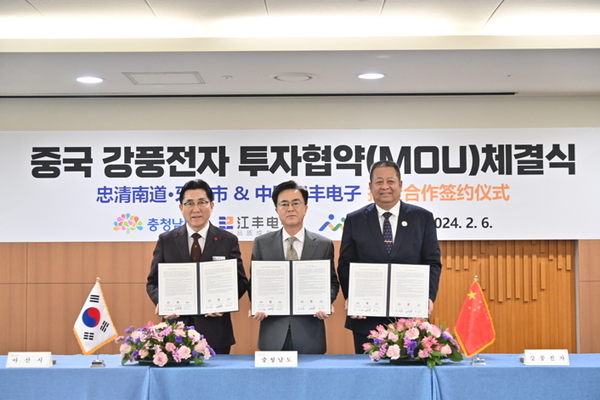 강풍전자는 6일(화) 충남도청에서 충남도, 아산시와 이 같은 내용의 투자협약(MOU)을 체결했다. 협약에 의히면, 충남도와 아산시는 아산 음봉 외투지역 지정을 통해 강풍전자에 공장 신축 부지를 임대해주고, 사업 인허가 취득과 공장 건설을 적극 지원하기로 했다.
