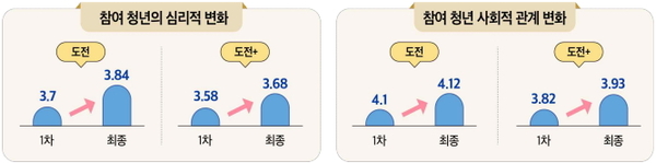 지난해 사업 참여자의 경우, ‘청년도전지원사업’을 통해 정서적 안정, 자신감 회복 및 진로 탐색 등에 많은 도움을 받았고, 심리상태 및 사회적 관계도 긍정적으로 향상된 것으로 나타났다.
