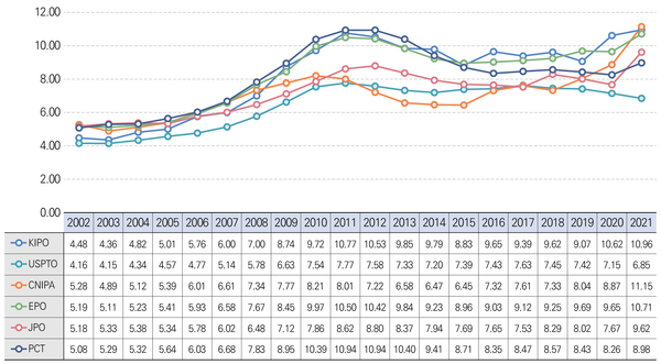 2002년 기준 IP5 및 PCT 특허출원에서 기후변화 완화 기술이 차지하는 비중은 평균 4.9% 수준이었으나, 2021년에는 평균 9.7%로 약 2배 가까이 증가했다.