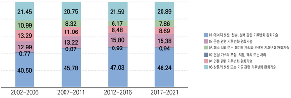 우리나라에서 기후변화 완화 기술 관련 6대 세부 분야 가운데 가장 높은 출원 비중을 차지하는 분야는 ‘에너지 생산, 전송, 분배 관련 기후변화 완화 기술(최근 5년 평균 46.2%)’로 나타났으며, ‘폐수 처리 또는 폐기물 관리와 관련된 기후변화 완화 기술’은 전체 비중은 낮지만 최근 5년간 가장 높은 연평균 증가율(32.5%)을 보였다.