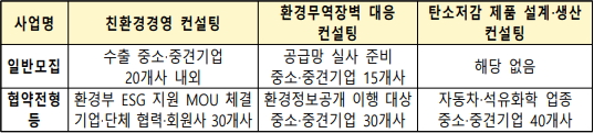 이 사업은 ▶친환경 공정진단·개선 ▶온실가스 배출량 목록(인벤토리) 구축 ▶ESG 교육 등 ESG 경영체계 구축을 위한 각종 사업을 컨설팅해 지원한다.