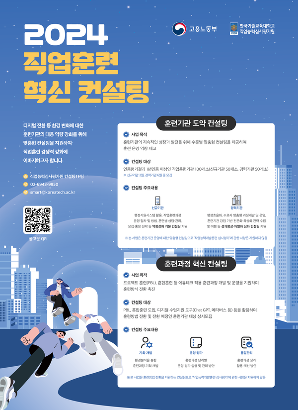 이를 위해 100여 명의 직업훈련 전문가, 우수 훈련기관 관계자 등으로 컨설팅 전담팀을 꾸려 1:1 컨설팅을 제공한다. 직업훈련 혁신 컨설팅은 ‘훈련기관 도약 컨설팅’과 ‘훈련과정 혁신 컨설팅’으로 구성된다.