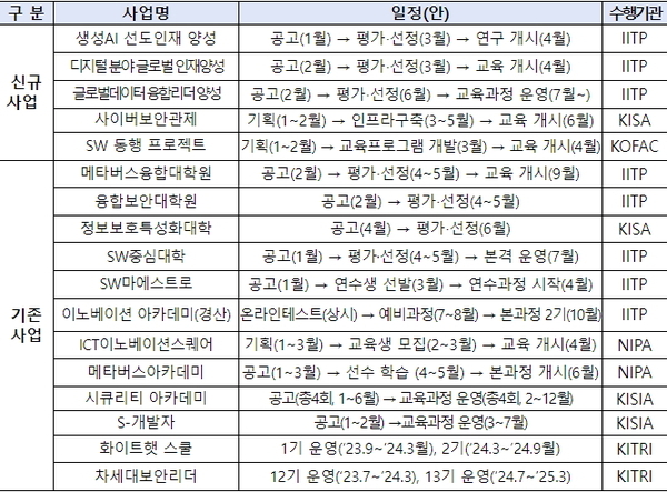 한편, 사업별 공고 일정 등은 과기정통부 및 정보통신기획평가원(IITP), 정보통신산업진흥원(NIPA), 한국인터넷진흥원(KISA), 한국과학창의재단(KOFAC), 한국정보보호산업협회(KISIA), 한국정보기술연구원(KITRI) 등 수행기관 홈페이지를 통해 확인할 수 있다.