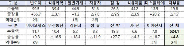 최대 품목인 반도체 수출은 99억 달러(+66.7%) 기록, 전월(+56.2%)에 이어 +50%를 상회하는 높은 증가율을 달성하며 4개월 연속 플러스를 달성했다.